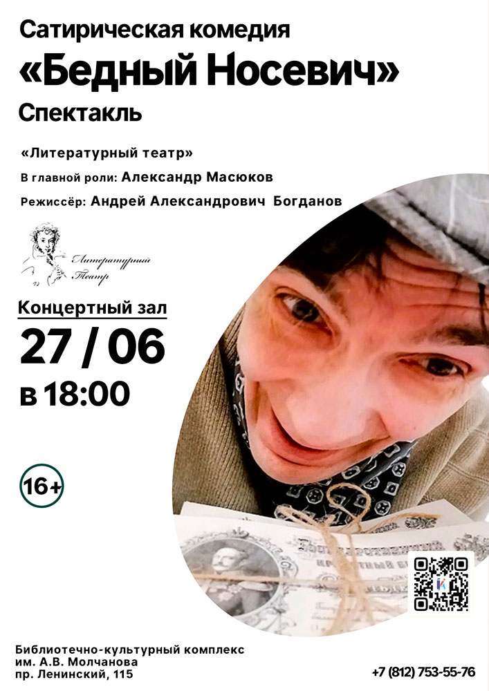 27 июня в 18.00 в Концертном зале Библиотечно-культурного комплекса им. А. В. Молчанова (Ленинский пр., д. 115) состоится Спектакль "Бедный Носевич".