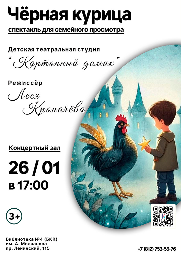 26 января в 17.00 в концертном зале Библиотеки №4 (Библиотечно-культурного комплекса) им. А. Молчанова (Ленинский пр., д. 115) состоится Спектакль для семейного просмотра "Чёрная курица".