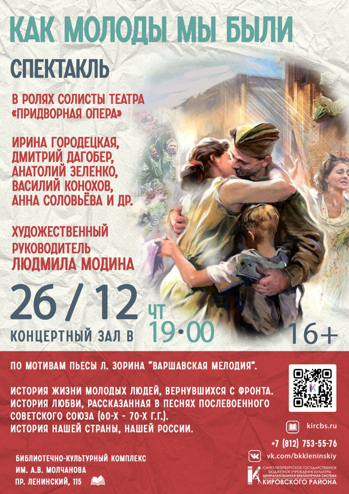 26 декабря в 19.00 в Концертном зале Библиотечно-культурного комплекса им. А. В. Молчанова (Ленинский пр., д. 115) состоится Спектакль "Как молоды мы были" по мотивам пьесы Леонида Зорина.
