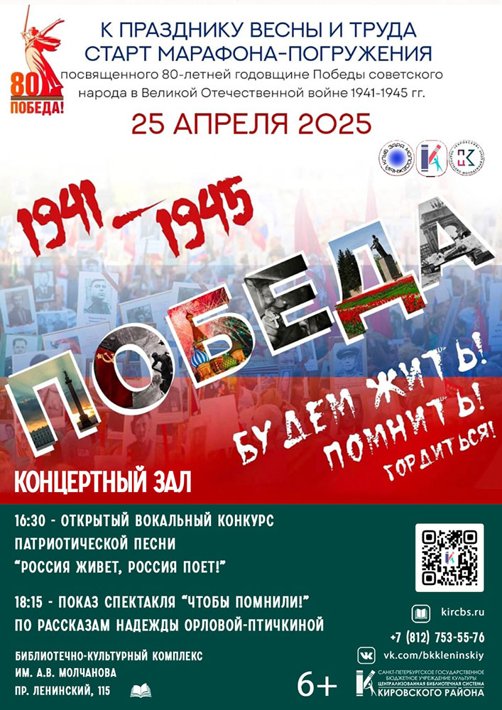 25 апреля в 16.30 в Концертном зале Библиотечно-культурного комплекса им. А. В. Молчанова (Ленинский пр., д. 115) к празднику весны и труда состоится Старт марафона-погружения "1941-1945. Победа. Будем жить! Помнить! Гордиться!", посвящённого 80-летней годовщины Победы советского народа в Великой отечественной войне 1941-1945 г.г.