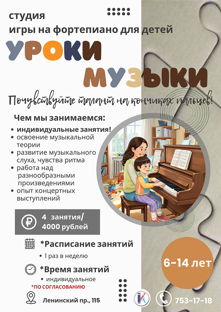 Если вы хотите подарить своему ребёнку волшебное приключение в мир классической и современной музыки, то мы ждём вас в нашей уютной студии "Уроки музыки".