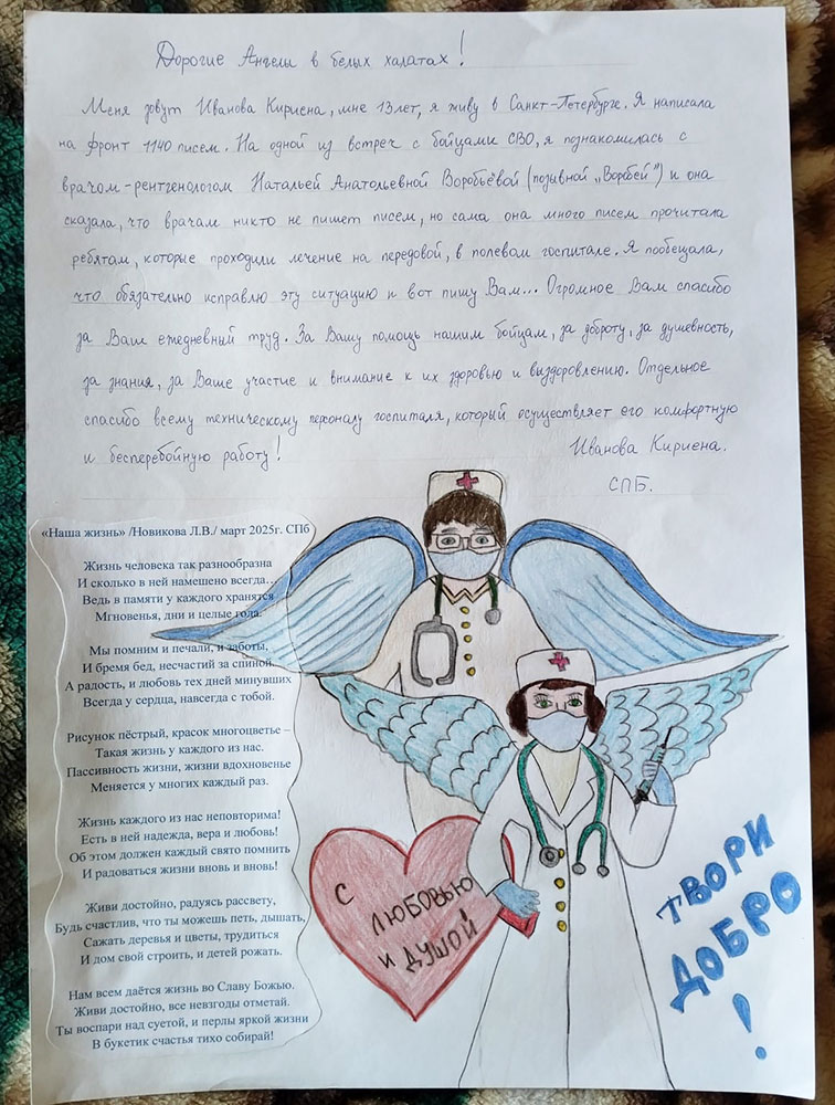 И здесь проект "Судьба и Родина едины" совершил переход от слова к делу. Услышав этот ответ, читательница нашей библиотеки, ученица 6 класса Кириена Иванова, вместе со своей семьей решила исправить эту несправедливость. До старта проекта она уже отправила на фронт более тысячи писем, а теперь пишет их и для медицинских работников, находящихся на передовой.