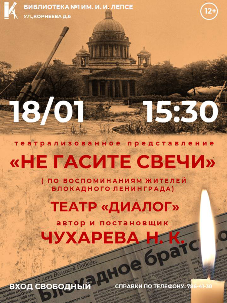 Библиотека №1 им. И. И. Лепсе приглашает на Театрализованное представление "Не гасите свечи" по воспоминаниям жителей блокадного Ленинграда в исполнении участников Театральной студии "Диалог".