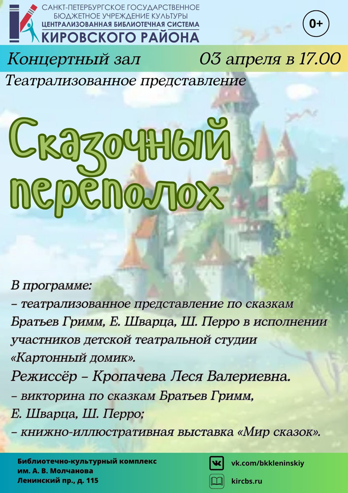 3 апреля в 17.00 в Концертном зале Библиотечно-культурного комплекса им. А. В. Молчанова (Ленинский пр., д. 115) состоится Театрализованное представление "Сказочный переполох".