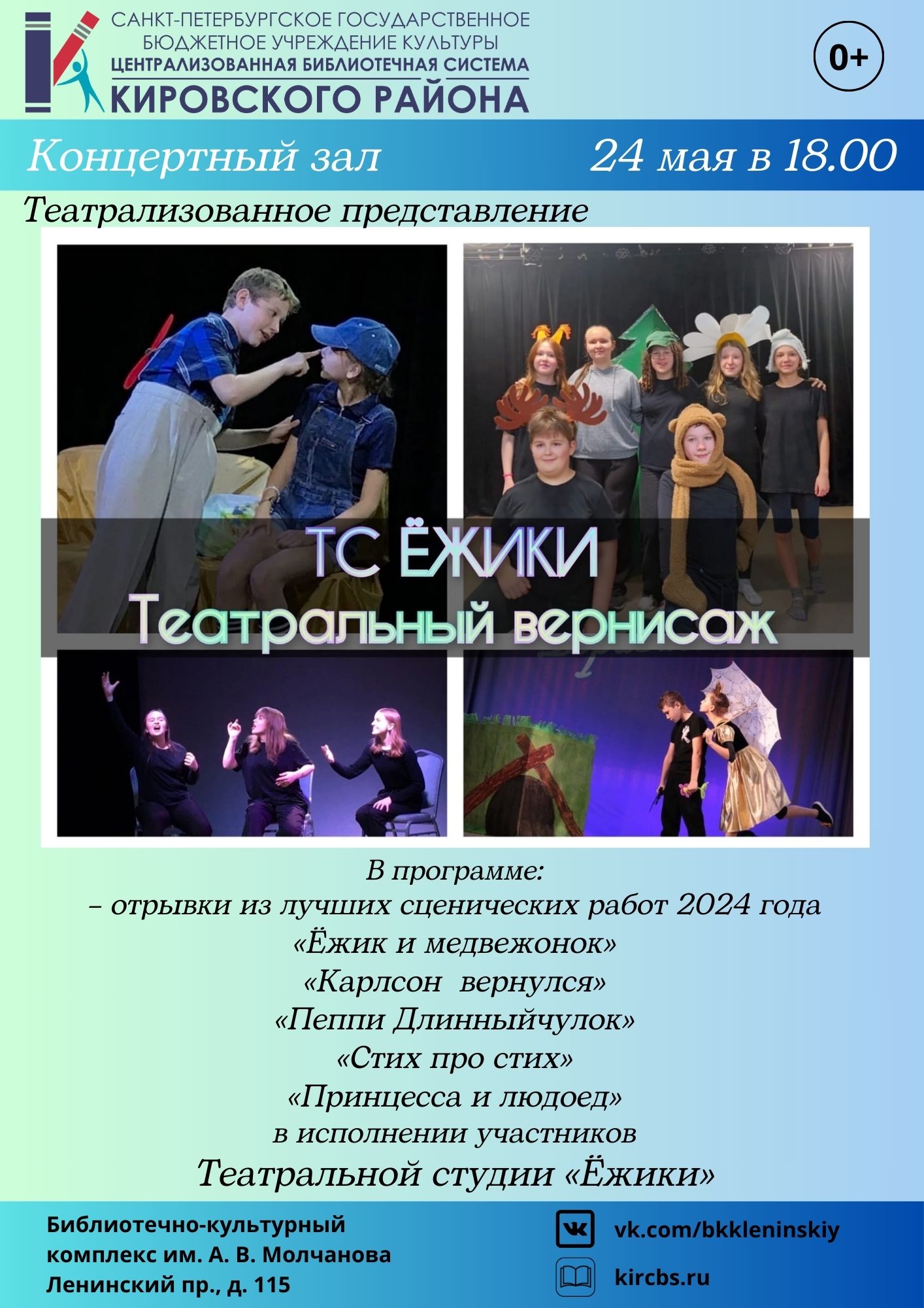 Гостям мероприятия, будут представлены отрывки из лучших сценических работ 2024 года: "Ёжик и медвежонок", "Карлсон вернулся", "Пеппи Длинныйчулок", "Стих про стих", "Принцесса и людоед" в исполнении участников театральной студии "Ёжики".