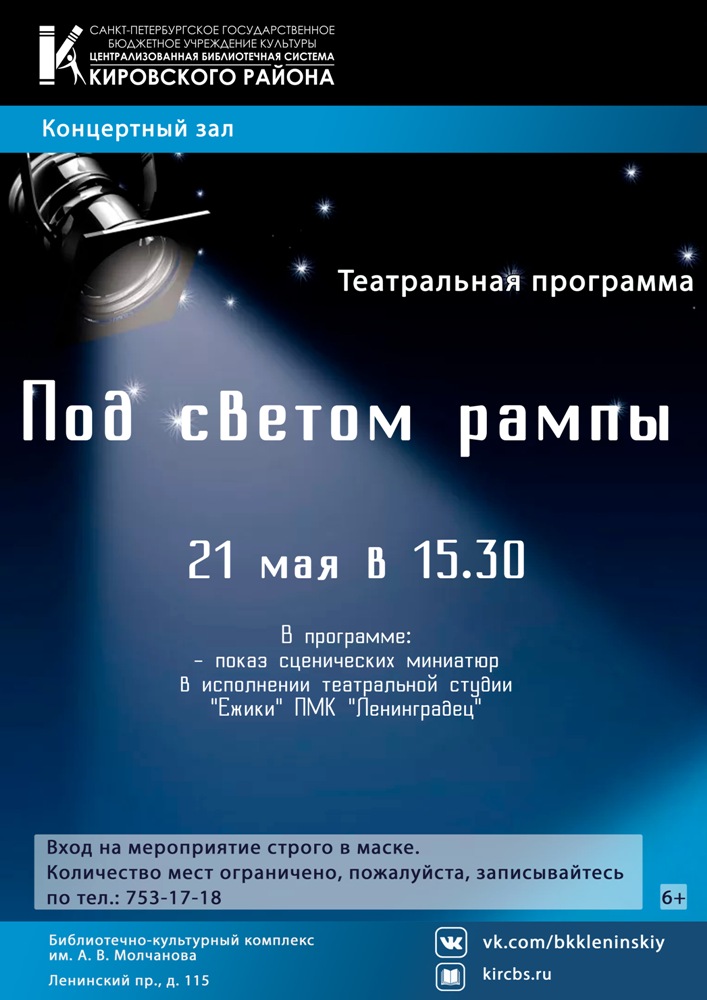 21 мая в 15.30 в концертном зале Библиотечно-культурного комплекса им. А. В. Молчанова состоится Театральная программа "Под светом рампы".