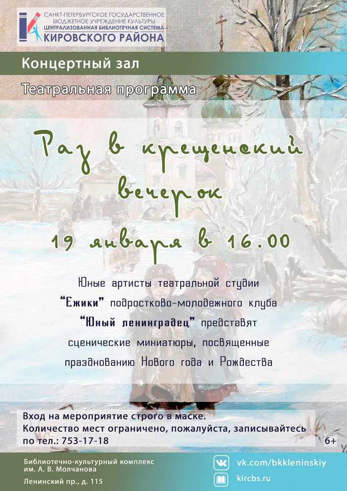 19 января в 16.00 в концертном зале Библиотечно-культурного комплекса им. А. В. Молчанова юными артистами театральной студии "Ёжики" подростково-молодежного клуба "Юный ленинградец" будут представлены сценические миниатюры в Театральной программе "Раз в крещенский вечерок", посвященной празднованию Нового года и Рождества Христова.