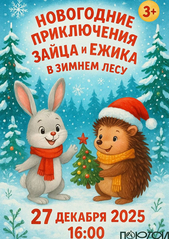 В преддверии Нового года библиотека "Портал" приглашает на театрально-музыкальное представление "Новогодние приключения Зайца и Ёжика в зимнем лесу". Для читателей и гостей библиотеки будет подготовлено театрализованное представление с персонажами из детских книг, а также иллюстративно-информационная презентация "Зимний лес".