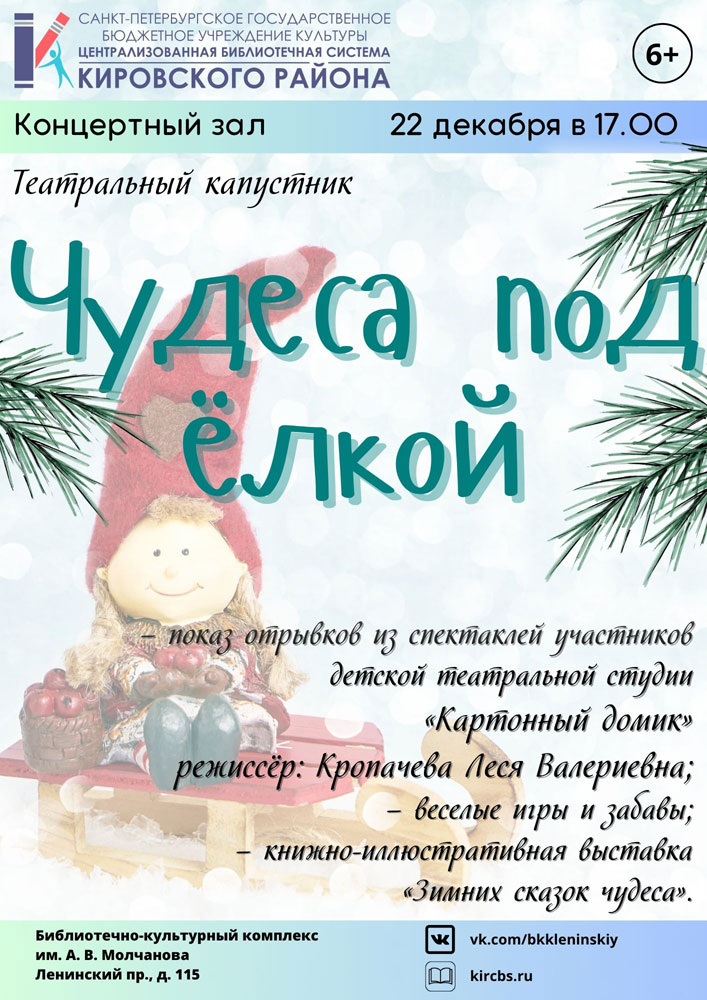 22 декабря в 17.00 в Библиотечно-культурном комплексе им. А. В. Молчанова (Ленинский пр., д. 115) состоится Театральный капустник "Чудеса под ёлкой", посвященный Новому году.