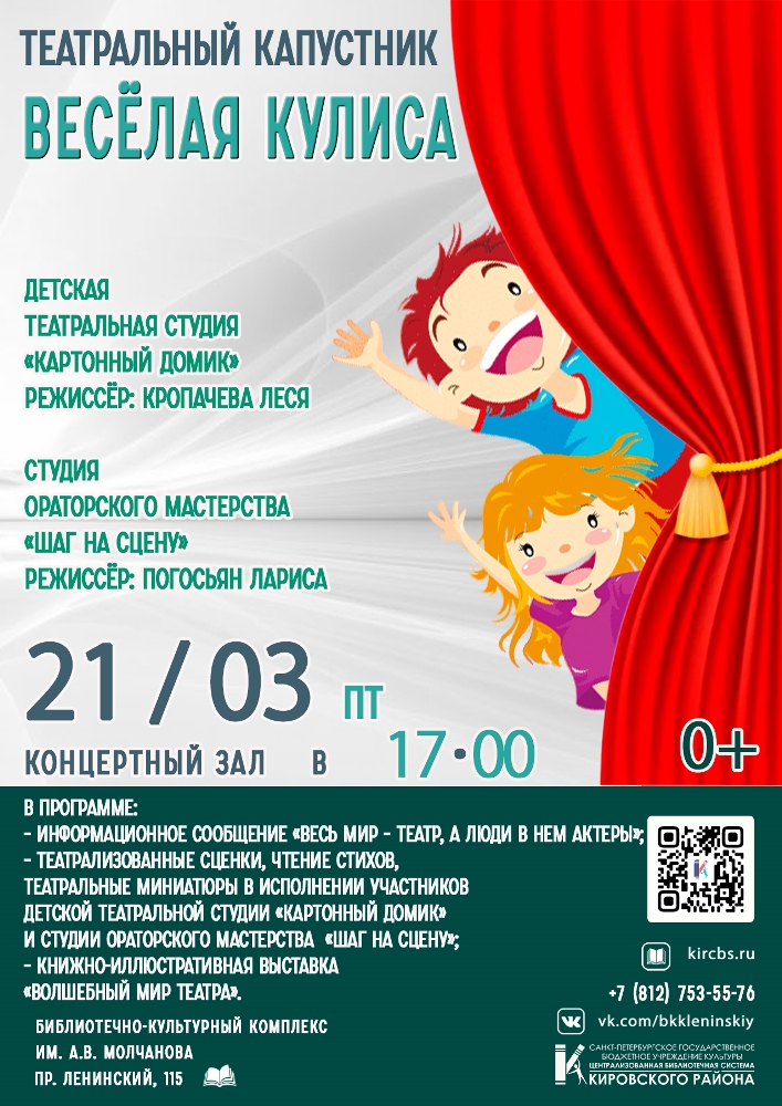 21 марта в 17.00 в Концертном зале Библиотеки №4/ Библиотечно-культурного комплекса им. А.В. Молчанова (Ленинский пр., д. 115) состоится театральный капустник "Весёлая кулиса".