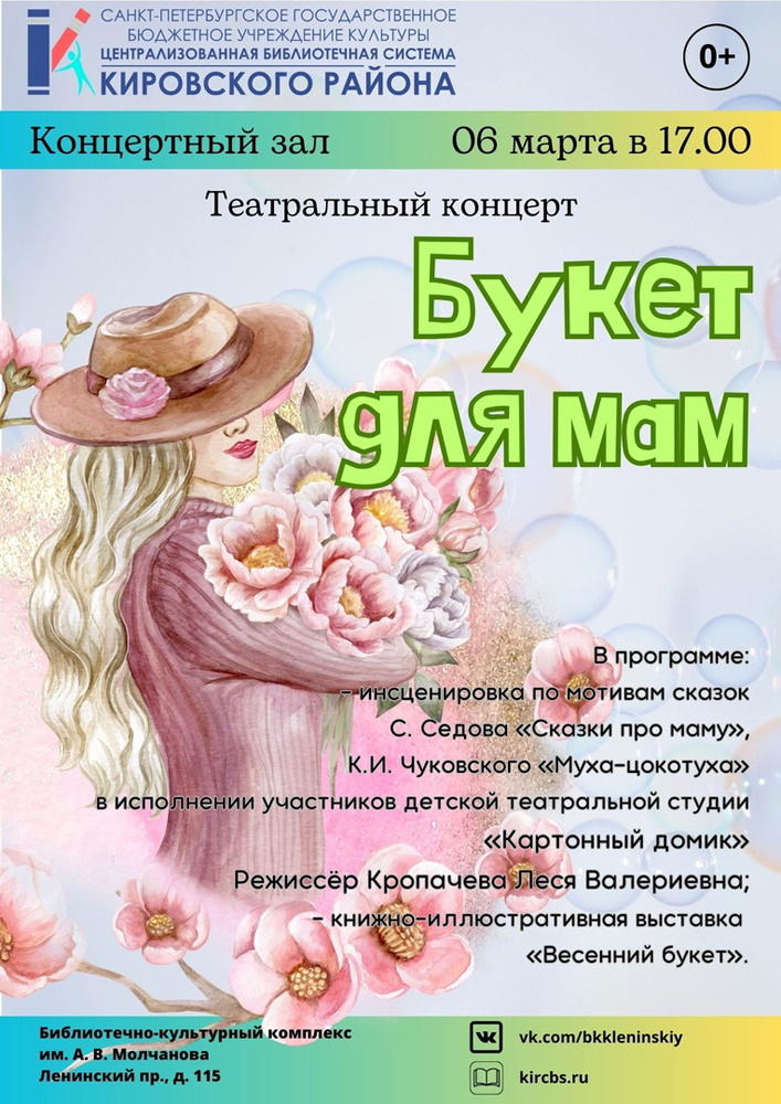 6 марта в 17.00 в Концертном зале Библиотечно-культурного комплекса им. А. В. Молчанова (Ленинский пр., д. 115) состоится Театральный концерт "Букет для мам".