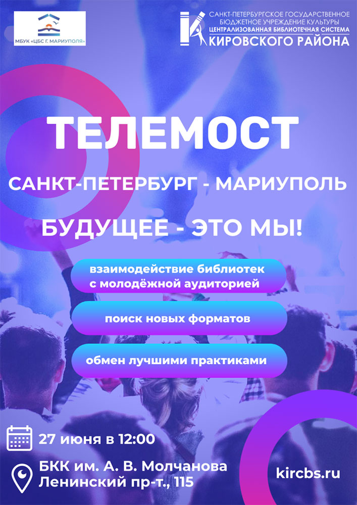 27 июня 2024 года в 12.00 в Библиотечно-культурном комплексе им. А. В. Молчанова (Ленинский проспект, д. 115) состоится телемост, объединяющий два города: "Санкт-Петербург - Мариуполь. Будущее - это мы!".
