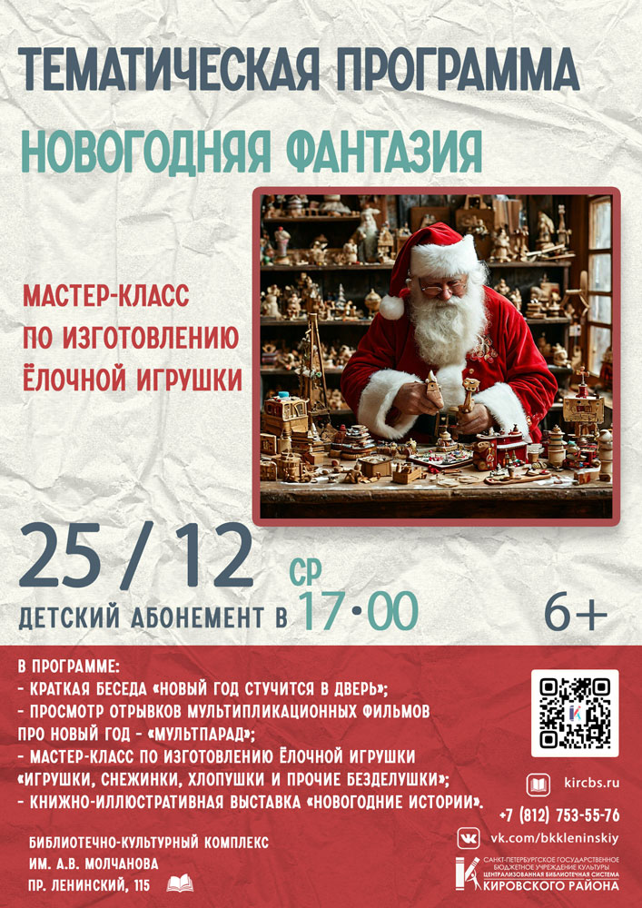 25 декабря в 17.00 в зале Детского абонемента Библиотечно-культурного комплекса им. А. В. Молчанова (Ленинский пр., д. 115) состоится Тематическая программа "Новогодняя фантазия".