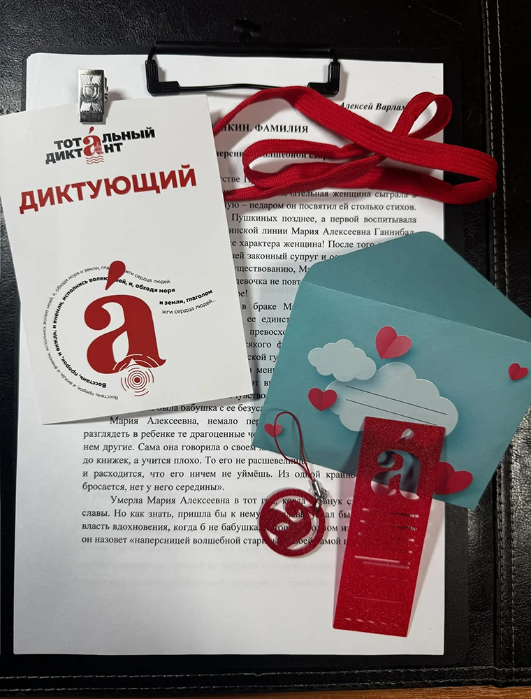 В этом году организаторы Тотального диктанта совместно с Банком "Санкт-Петербург" подготовили 12 000 ручек для участников Тотального диктанта. Среди них были особенные - 323 штуки. Именно столько лет в этом году исполняется Санкт-Петербургу. Такая ручка попалась и одному из участников на нашей площадке, а это значит, что при вручении работ его ждет дополнительный подарок!