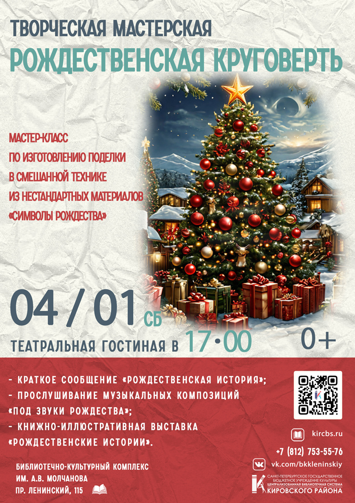 4 января в 17.00 в Театральной гостиной Библиотечно-культурного комплекса им. А. В. Молчанова (Ленинский пр., д. 115) состоится Творческая мастерская "Рождественская круговерть".