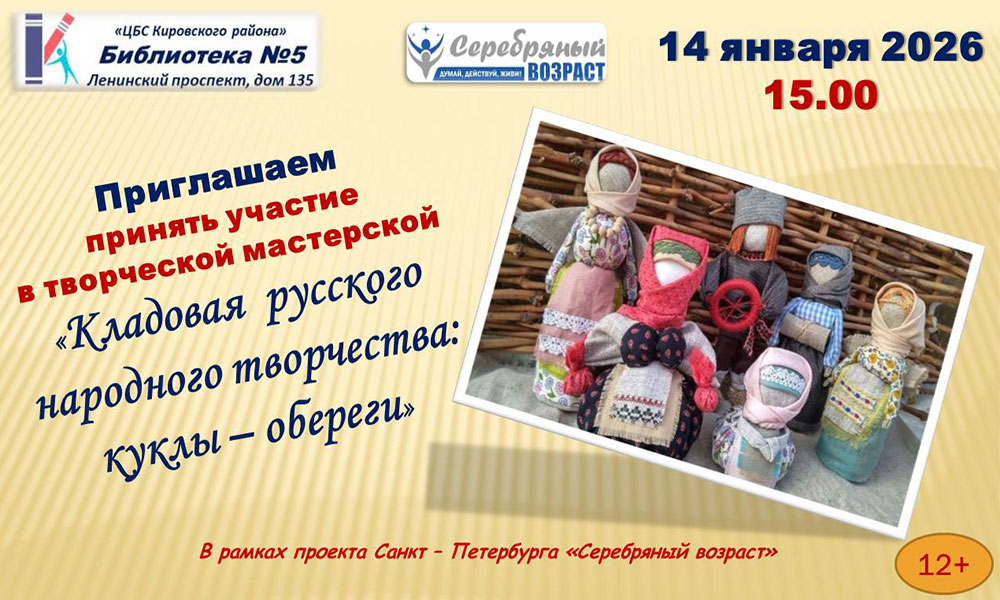 В рамках проекта Санкт-Петербурга "Серебряный возраст" в Библиотеке №5 пройдет Творческая мастерская "Кладовая народного творчества: куклы-обереги".
