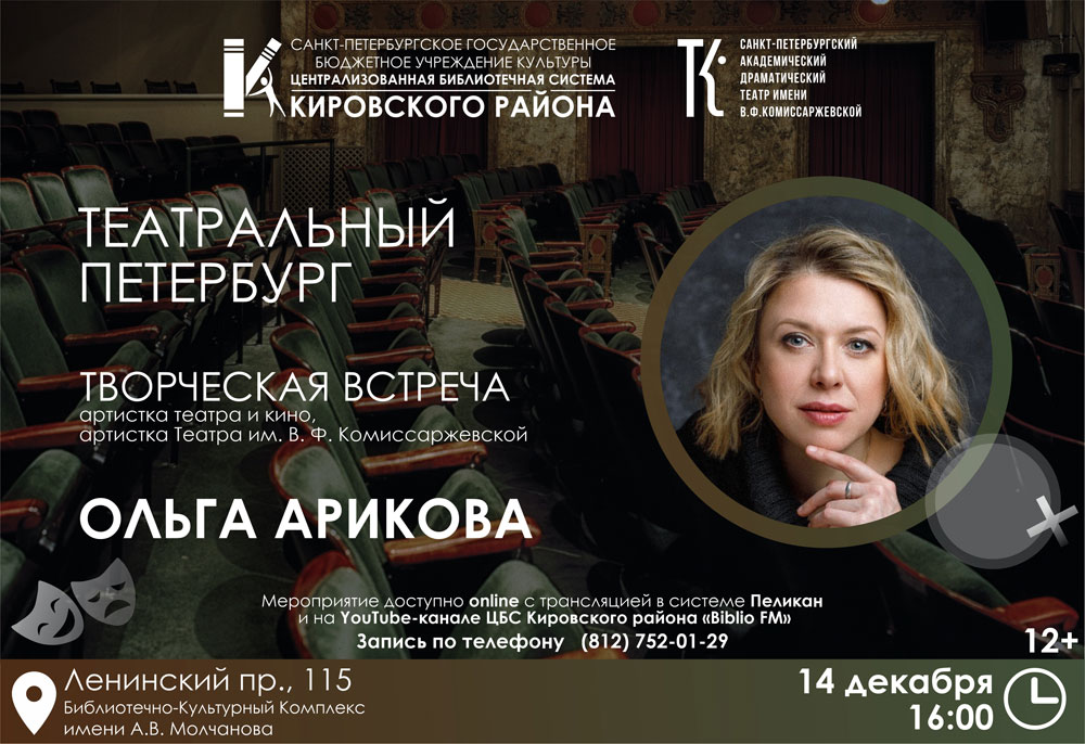 14 декабря 2023 года в театрально-концертном зале Библиотечно-культурного комплекса им. А. В. Молчанова (Ленинский пр., 115) в рамках проекта "Театральный Петербург" состоится творческая встреча с артисткой театра и кино, актрисой Театра им. В. Ф. Комиссаржевской Ольгой Ариковой.