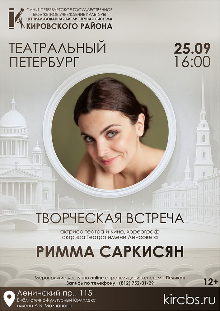 25 сентября 2025 года в 16.00 в Библиотечно-культурном комплексе им. А. В. Молчанова (Ленинский проспект 115) в рамках проекта "Театральный Петербург" состоится творческая встреча с актрисой театра и кино, режиссёром по пластике, хореографом-постановщиком, актрисой Театра имени Ленсовета Риммой Артуровной Саркисян.