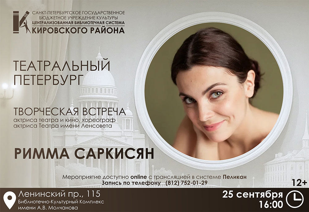 25 сентября 2025 года в 16.00 в Библиотечно-культурном комплексе им. А. В. Молчанова (Ленинский проспект 115) в рамках проекта "Театральный Петербург" состоится творческая встреча с актрисой театра и кино, режиссёром по пластике, хореографом-постановщиком, актрисой Театра имени Ленсовета Риммой Артуровной Саркисян.