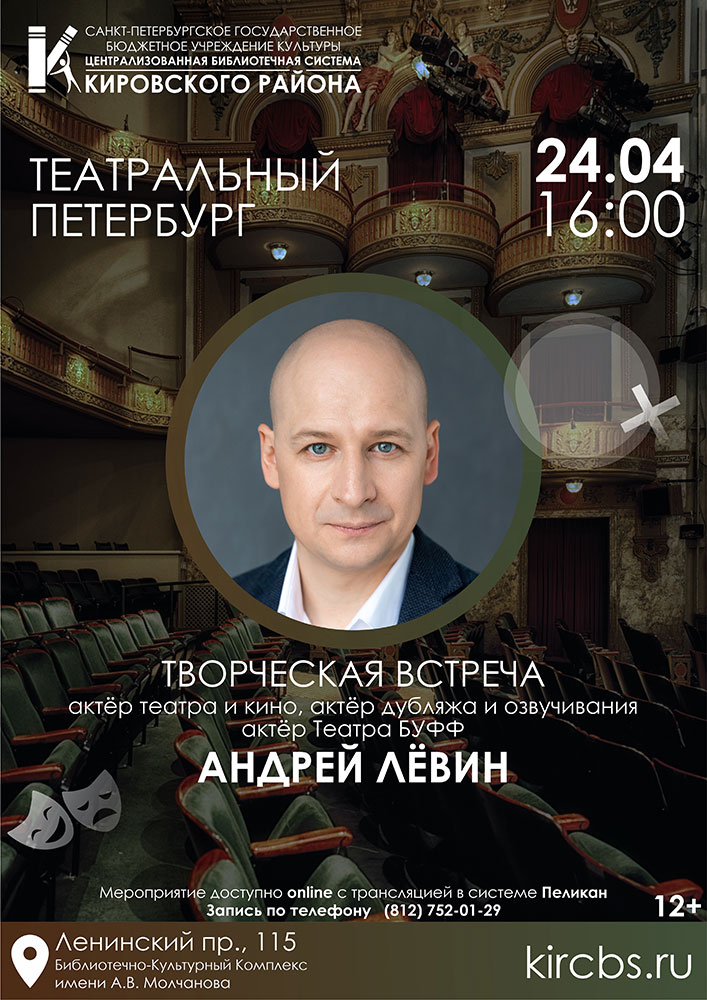 24 апреля 2025 года в 16.00 в Библиотечно-культурном комплексе им. А. В. Молчанова (Ленинский проспект 115) в рамках проекта "Театральный Петербург" состоится творческая встреча с актёром театра и кино, актёром дубляжа и озвучивания, актёром Театра БУФФ Андреем Александровичем Лёвиным.