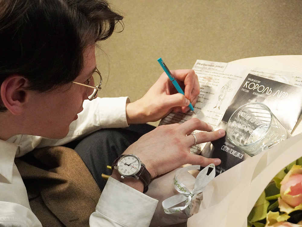 На творческой встрече были показаны фрагменты спектаклей Театра имени Ленсовета "Мёртвые души" по мотивам произведения Николая Гоголя (реж. Роман Кочержевский), "Король Лир" по пьесе Уильяма Шекспира (реж. Фёдор Пшеничный), "Академия смеха" по пьесе Коки Митани (реж. Фёдор Пшеничный).