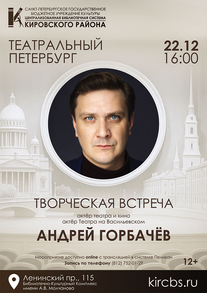 22 декабря 2025 года в 16.00 в Библиотечно-культурном комплексе им. А. Молчанова (Ленинский пр., д. 115) в рамках проекта "Театральный Петербург" состоится творческая встреча с актёром театра и кино, актёром Театра на Васильевском Андреем Леонидовичем Горбачёвым.