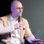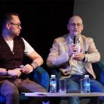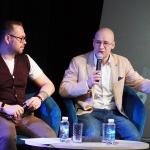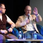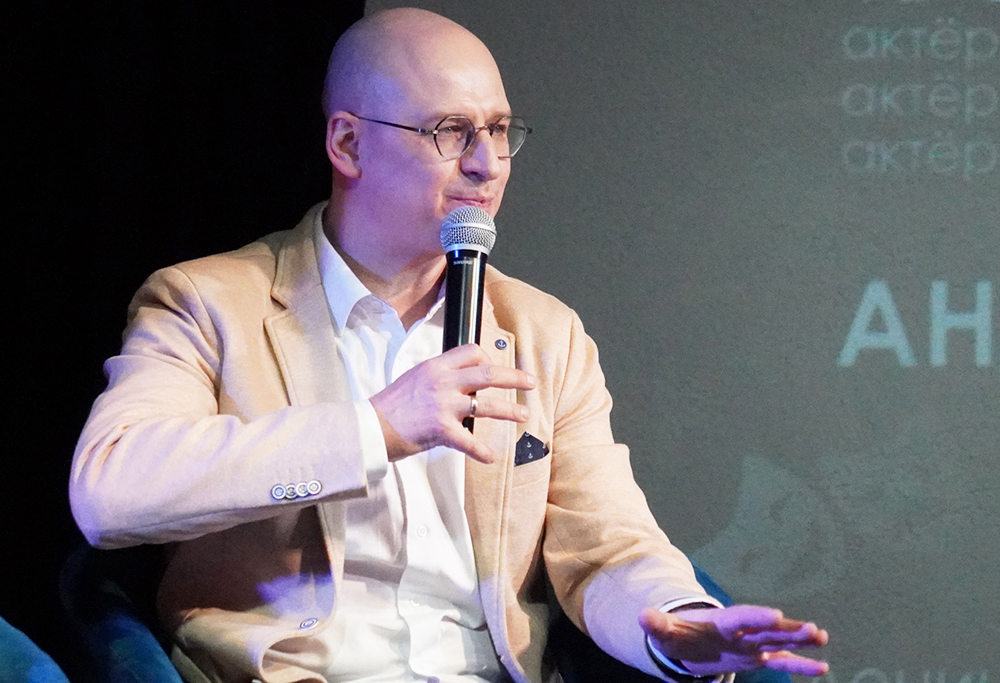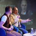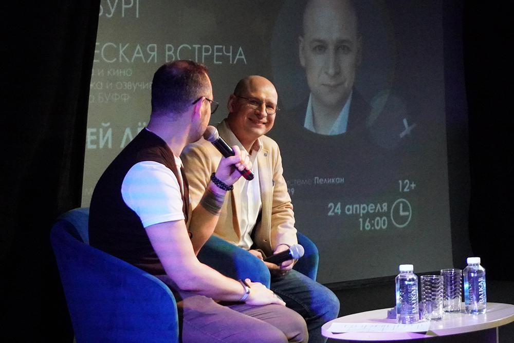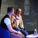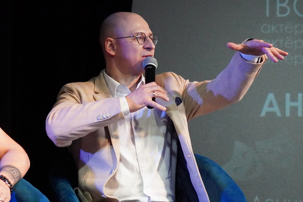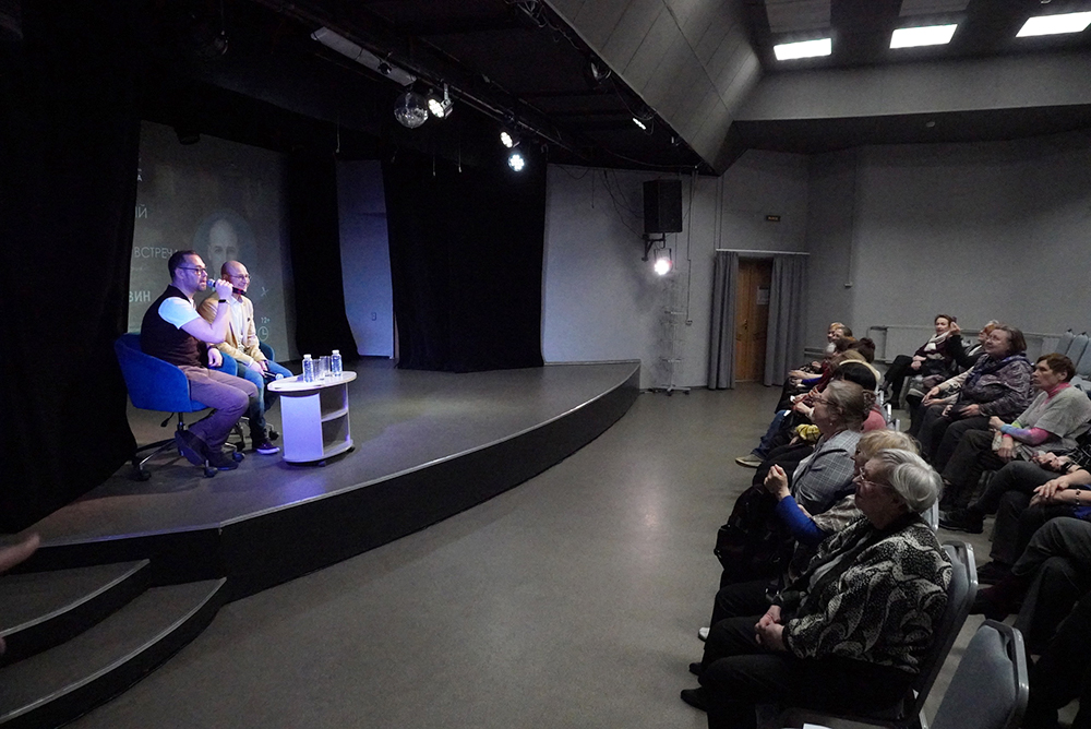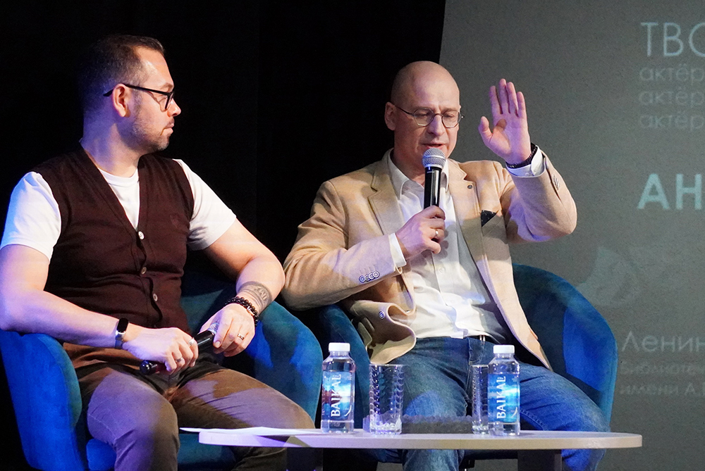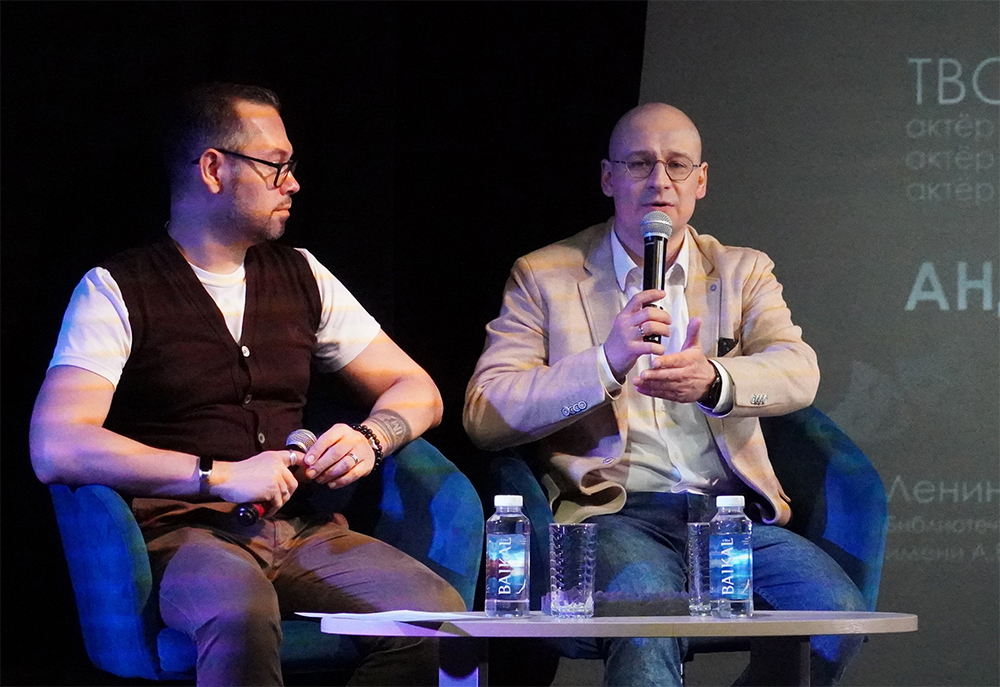 Модератор встречи Илья Мясников задавал вопросы Андрею Лёвину о его творческом пути, актёрских работах в театре и кино, а также о его работе актёром дубляжа и озвучивания.