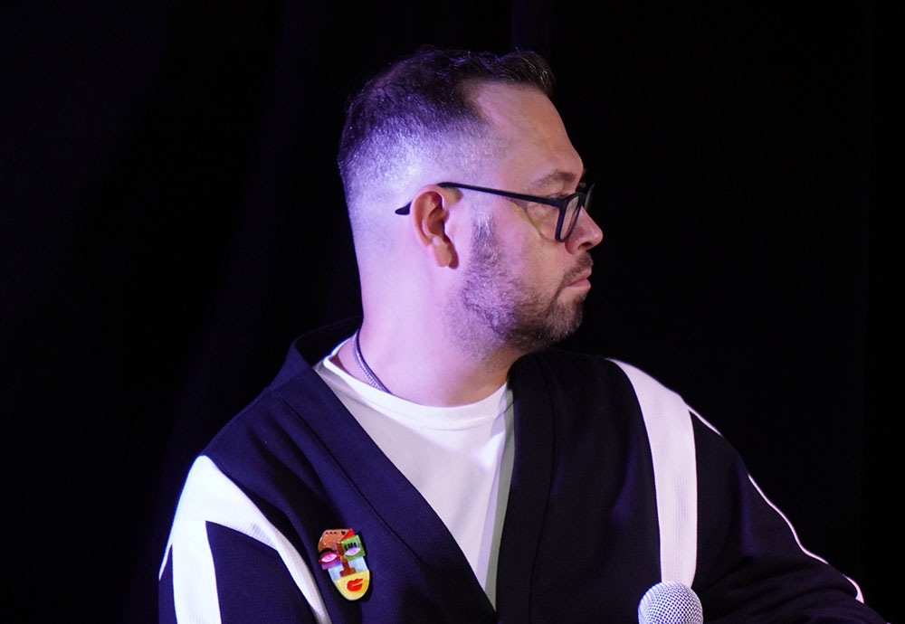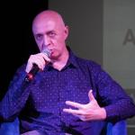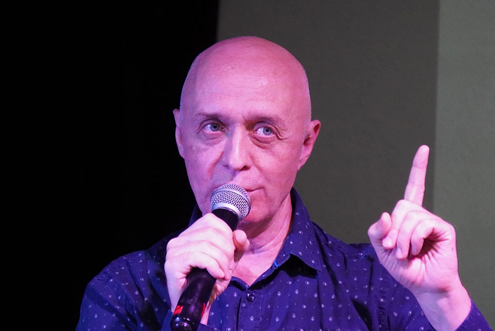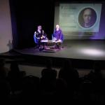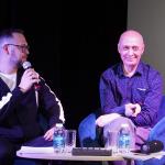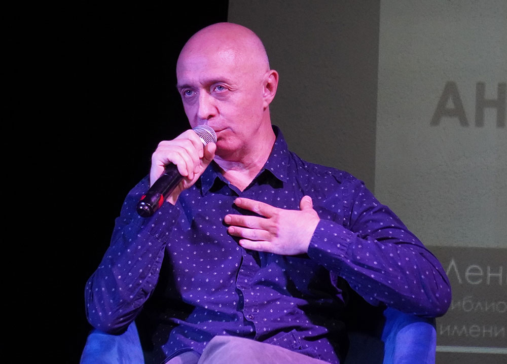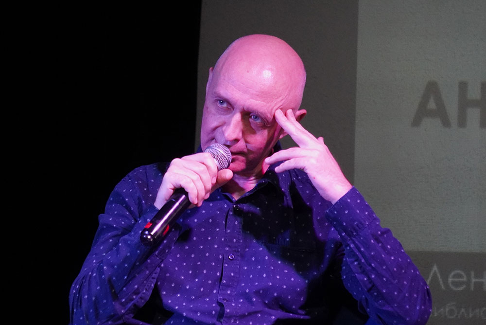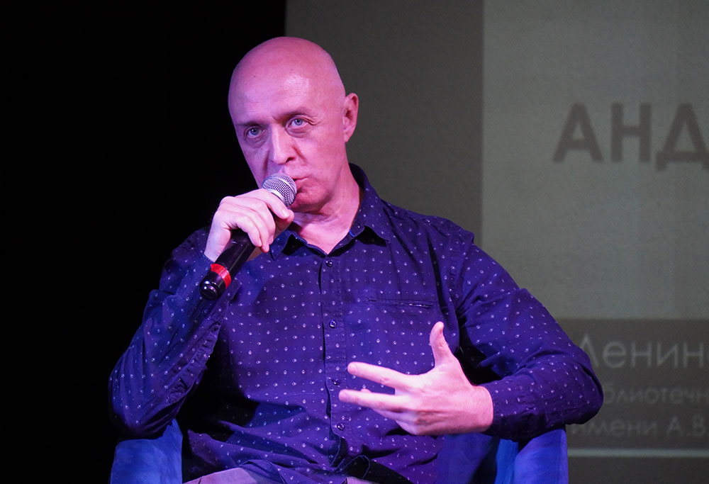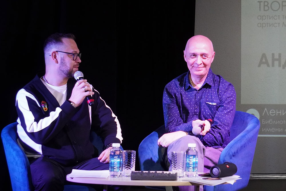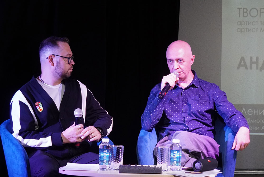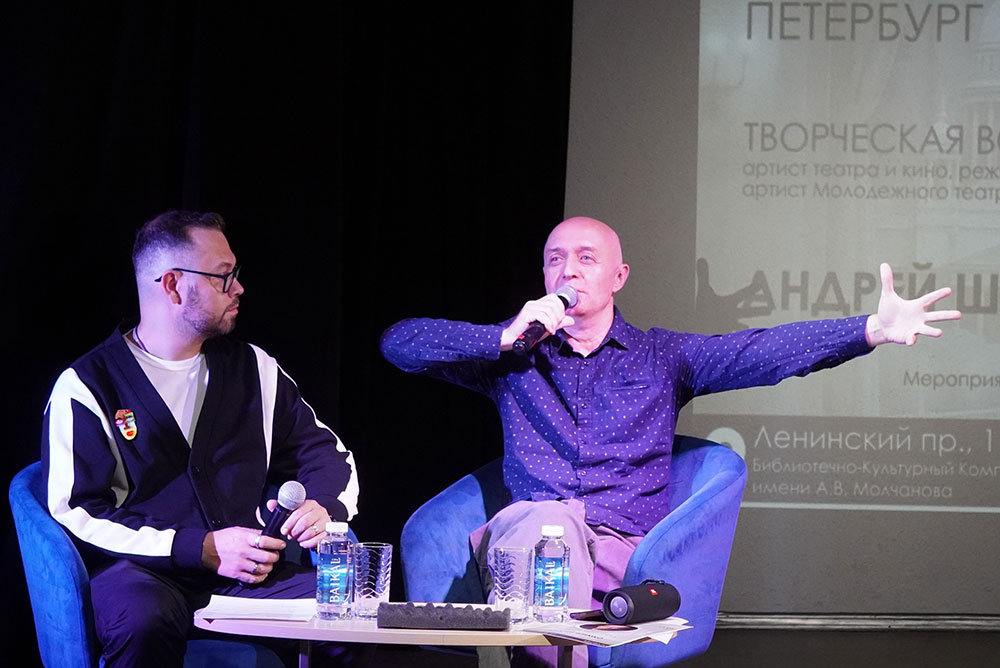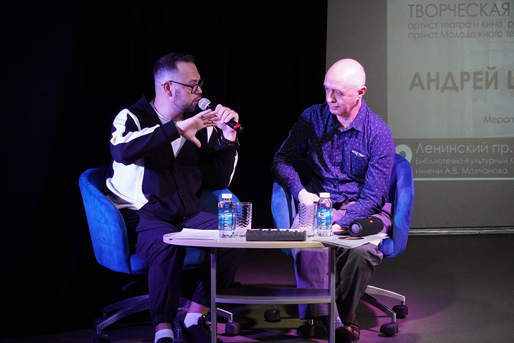 Модератор встречи Илья Мясников задавал вопросы Андрею Шимко о его творческом пути, актёрских работах в театре и кино, педагогической деятельности.