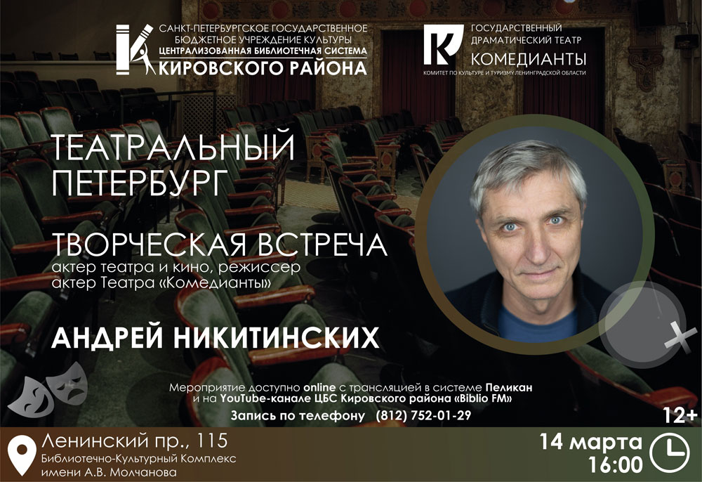 14 марта 2024 года в театрально-концертном зале Библиотечно-культурного комплекса им. А. В. Молчанова (Ленинский пр., 115) в рамках проекта "Театральный Петербург" состоится творческая встреча с Андреем Никитинских, артистом театра и кино, режиссером, артистом Театра "Комедианты".