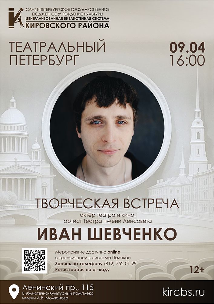 9 апреля 2026 года в 16.00 в Библиотеке №4 (Библиотечно-культурном комплексе) им. А. В. Молчанова (Ленинский пр., д. 115) в рамках проекта "Театральный Петербург" состоится творческая встреча с актёром театра и кино, артистом Театра имени Ленсовета Иваном Григорьевичем Шевченко.