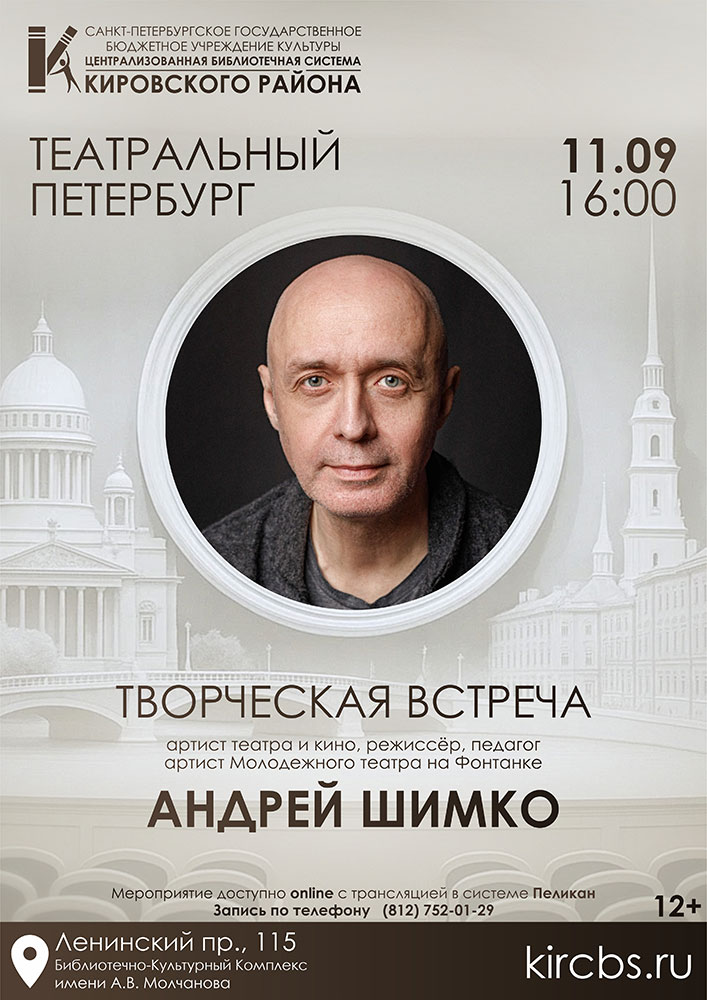 11 сентября 2025 года в 16.00 в Библиотечно-культурном комплексе им. А. В. Молчанова (Ленинский проспект, д. 115) в рамках проекта "Театральный Петербург" состоится творческая встреча с артистом театра и кино, режиссёром, педагогом, артистом Молодежного театра на Фонтанке Андреем Николаевичем Шимко.