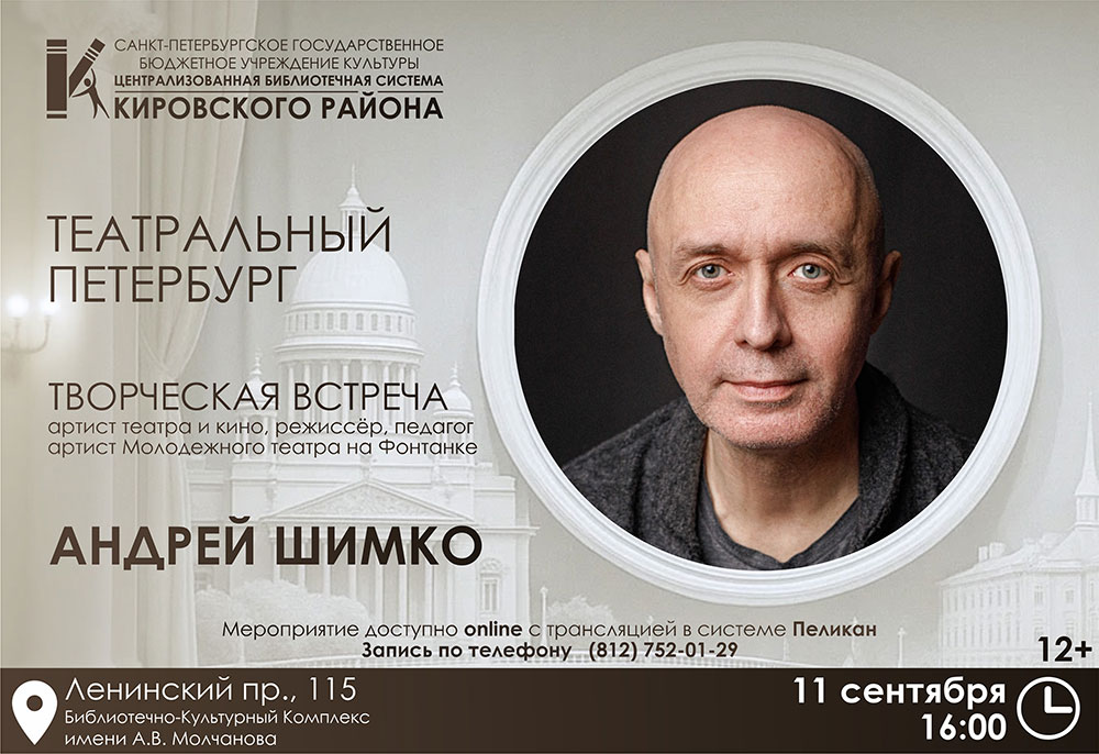 11 сентября 2025 года в 16.00 в Библиотечно-культурном комплексе им. А. В. Молчанова (Ленинский проспект, д. 115) в рамках проекта "Театральный Петербург" состоится творческая встреча с артистом театра и кино, режиссёром, педагогом, артистом Молодежного театра на Фонтанке Андреем Николаевичем Шимко.