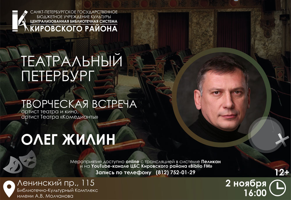 2 ноября 2023 года в театрально-концертном зале Библиотечно-культурного комплекса им. А. В. Молчанова (Ленинский пр., д. 115) в рамках проекта "Театральный Петербург" состоится творческая встреча с Олегом Жилиным, артистом театра и кино, артистом Театра "Комедианты" (12+).