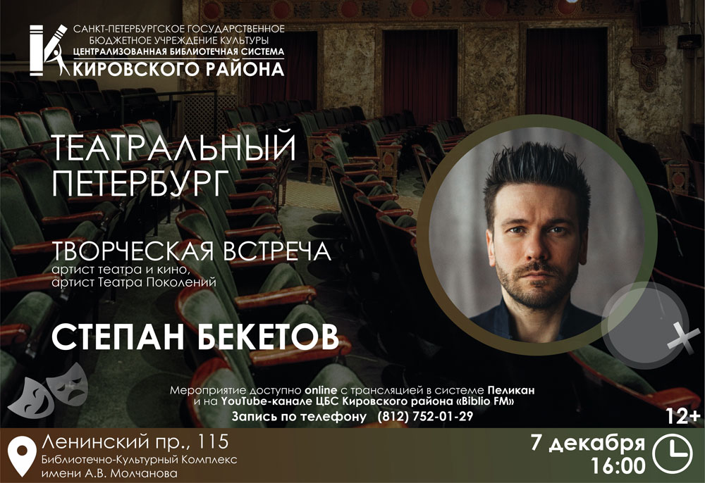 7 декабря 2023 года в театрально-концертном зале Библиотечно-культурного комплекса им. А. В. Молчанова (Ленинский пр., 115) в рамках проекта "Театральный Петербург" состоится творческая встреча с артистом театра и кино, артистом "Театра Поколений" Степаном Бекетовым.