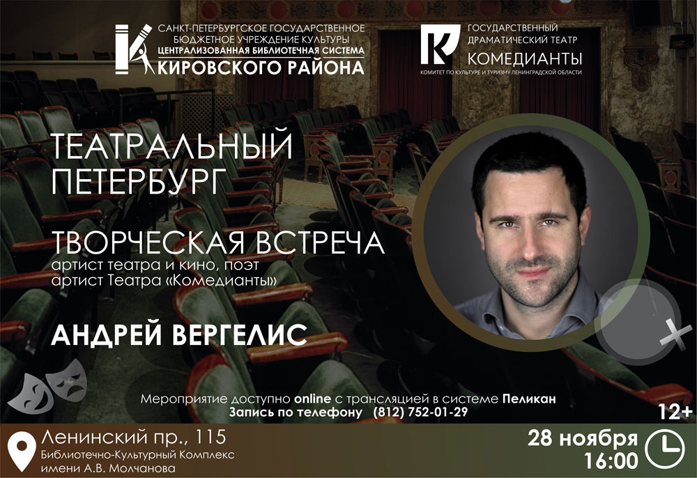 28 ноября 2024 года в 16.00 в Библиотечно-культурном комплексе им. А. В. Молчанова в рамках проекта "Театральный Петербург" состоится творческая встреча с артистом театра и кино, поэтом, артистом Театра "Комедианты" Андреем Вергелисом.