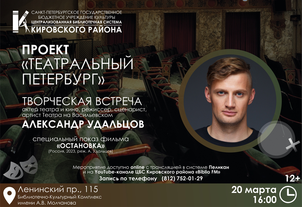 20 марта 2023 года в 16.00 в театрально-концертном зале Библиотечно-культурного комплекса им. А. В. Молчанова (Ленинский пр., 115) в рамках проекта "Театральный Петербург" состоится творческая встреча с артистом театра и кино, режиссером, сценаристом, артистом Театра на Васильевском Александром Удальцовым.