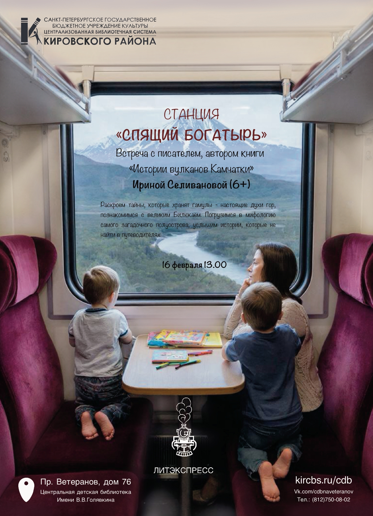 Наших "пассажиров" ожидает увлекательная встреча с писателем, автором книги "Истории вулканов Камчатки" Ириной Селивановой. Мы услышим удивительные истории, героями которых станут настоящие духи гор - гамулы, во главе с самым главным духом - Билюкаем, а также сами вулканы и сопки. Познакомимся с природой Камчатки, узнаем, что вулкан не просто гора, он дышит, живет, и иногда злится. Автор с удовольствием ответит на все вопросы самых любознательных читателей и гостей библиотеки. И вам обязательно захочется отправиться на Камчатку, чтобы увидеть все ее чудеса своими глазами.