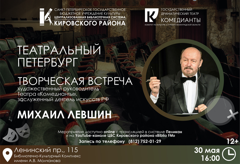 30 мая 2024 года в 16.00 в театрально-концертном зале Библиотечно-культурного комплекса им. А. В. Молчанова (Ленинский пр., 115) в рамках проекта "Театральный Петербург" состоится творческая встреча с Михаилом Левшиным, художественным руководителем Театра "Комедианты", заслуженным деятелем искусств РФ.