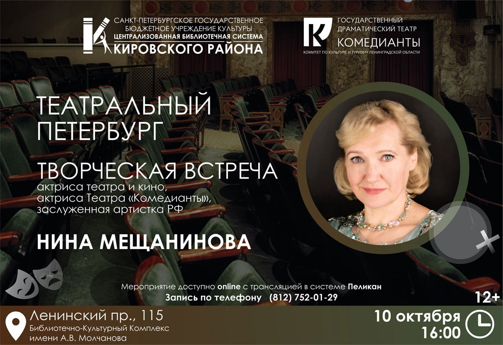 10 октября 2024 года в 16.00 в Библиотечно-культурном комплексе им. А. В. Молчанова в рамках проекта "Театральный Петербург" состоится творческая встреча с Ниной Ивановной Мещаниновой, актрисой театра и кино, актрисой Театра "Комедианты", заслуженной артисткой Российской Федерации.