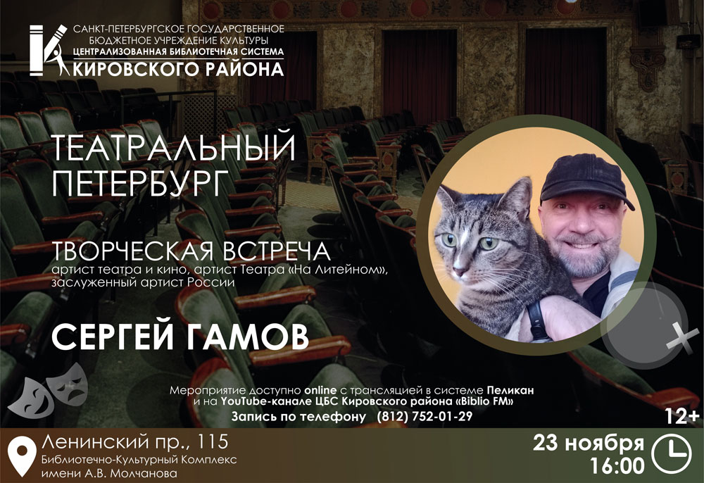 23 ноября 2023 года в 16.00 в театрально-концертном зале Библиотечно-культурного комплекса им. А. В. Молчанова (Ленинский пр., 115) в рамках проекта "Театральный Петербург" состоится творческая встреча с Сергеем Петровичем Гамовым, артистом театра и кино, заслуженным артистом России, артистом Театра "На Литейном".