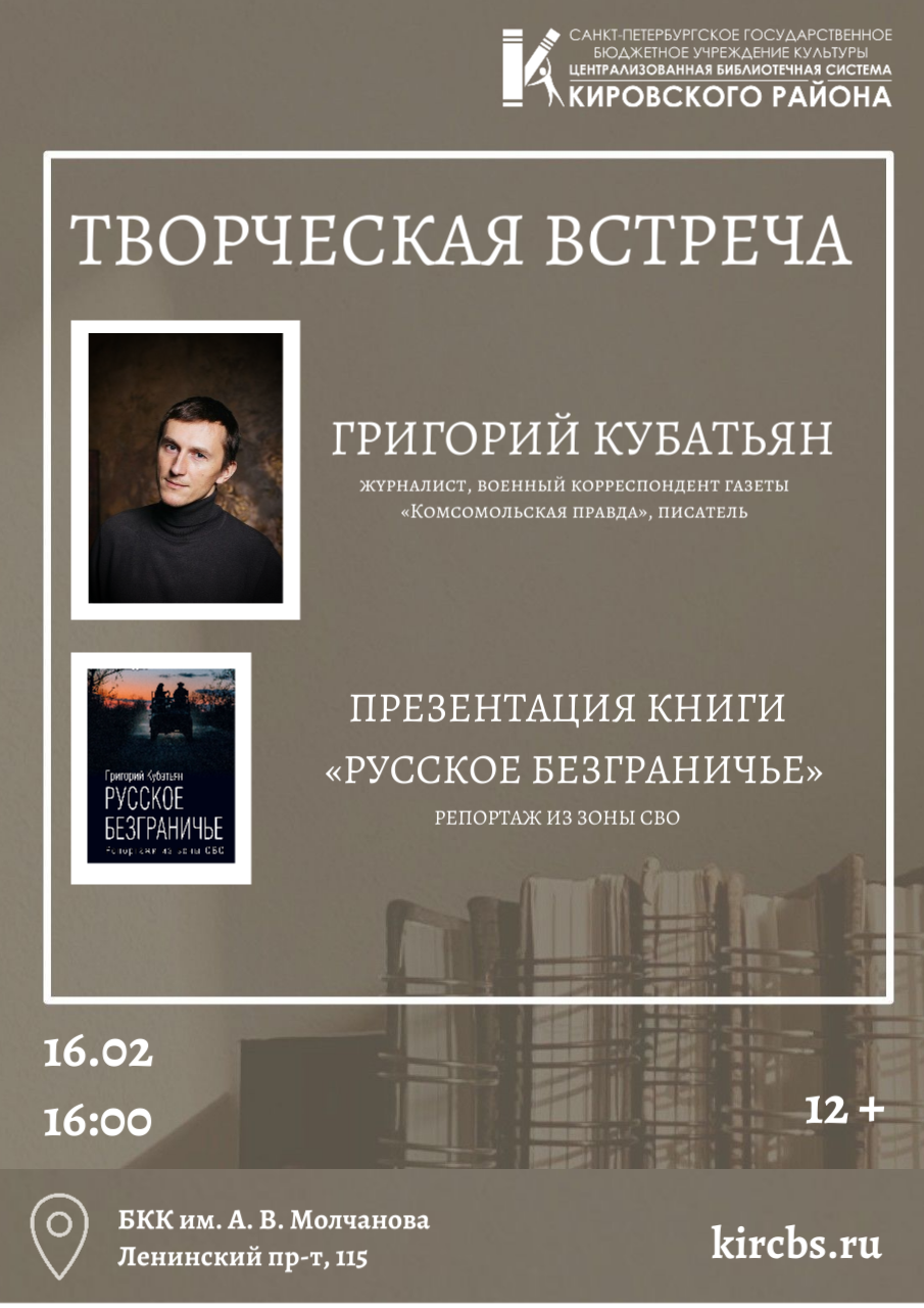 16 февраля в 16.00 в Библиотечно-культурном комплексе им. А. В. Молчанова (Ленинский пр., д. 115) состоится творческая встреча с журналистом, военным корреспондентом газеты "Комсомольская правда", писателем, путешественником, членом Русского географического общества Григорием Кубатьяном.