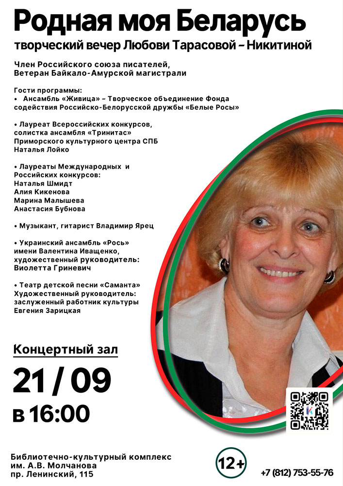 21 сентября в 16.00 в Литературной гостиной Библиотечно-культурного комплекса им. А. В. Молчанова (Ленинский пр., д. 115) состоится Творческий вечер Любови Тарасовой-Никитиной "Родная моя Беларусь".