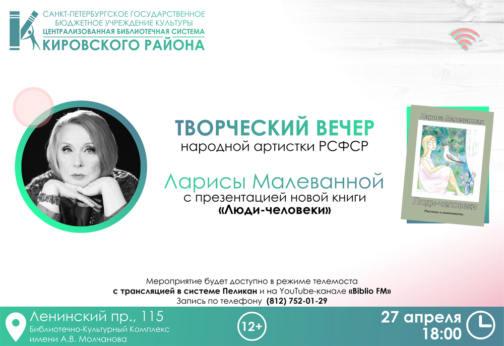 27 апреля 2023 года в 18.00 в БКК им. А. В. Молчанова Централизованной библиотечной системы Кировского района (далее ЦБС Кировского района) состоится творческий вечер народной артистки РСФСР, советской, российской актрисы театра и кино, режиссёра и литератора Ларисы Малеванной. Тема встречи - презентация новой книги автора "Люди-человеки".