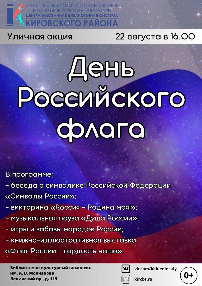 22 августа в 16.00 на уличной площадке Библиотеки №4/ Библиотечно-культурном комплексе им. А.В. Молчанова (Ленинский пр., д. 115) состоится уличная акция "День Российского флага", посвящённая Дню Государственного флага Российской Федерации (22 августа). (0+)