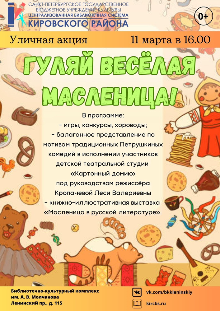 11 марта в 16.00 на уличной площадке Библиотечно-культурного комплекса им. А. В. Молчанова (Ленинский пр., д. 115) состоится Уличная акция "Гуляй весёлая Масленица!".