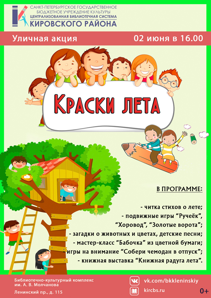 2 июня в 16.00 в Библиотечно-культурном комплексе им. А. В. Молчанова (Ленинский пр., д. 115) состоится Уличная акция "Краски лета".