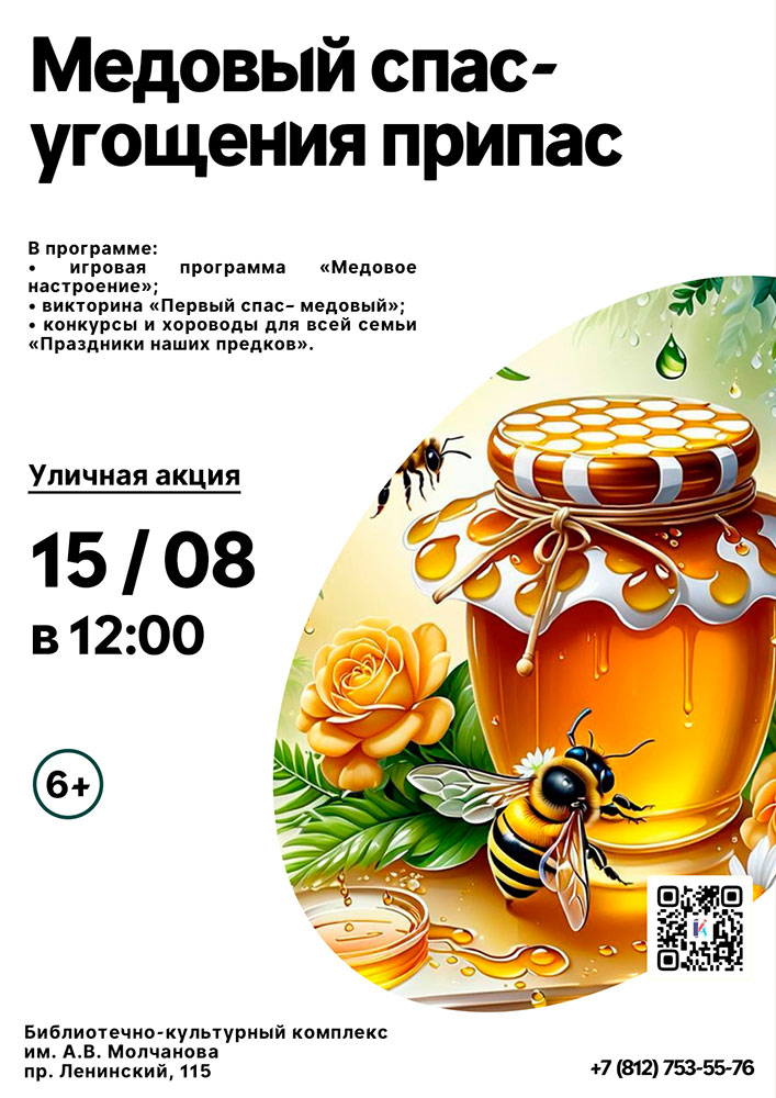 15 августа в 12.00 на уличной площадке Библиотечно-культурного комплекса им. А. В. Молчанова (Ленинский пр., д. 115) состоится Уличная акция "Медовый спас - угощения припас".