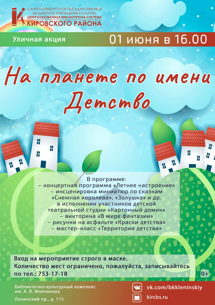 1 июня в 16.00 на уличной площадке Библиотечно-культурного комплекса им. А. В. Молчанова будет проходить Уличная акция "На планете по имени Детство".
