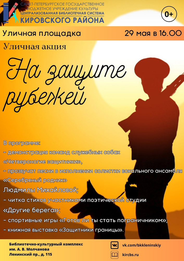 29 мая в 16.00 на уличной площадке Библиотечно-культурного комплекса им. А. В. Молчанова (Ленинский пр., д. 115) состоится Уличная акция "На защите рубежей".