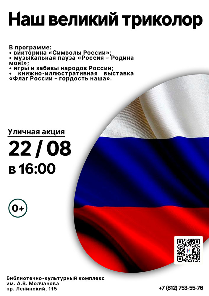 22 августа в 16.00 на Уличной площадке Библиотечно-культурного комплекса им. А. В. Молчанова (Ленинский пр., д. 115) состоится Уличная акция "Наш великий триколор".
